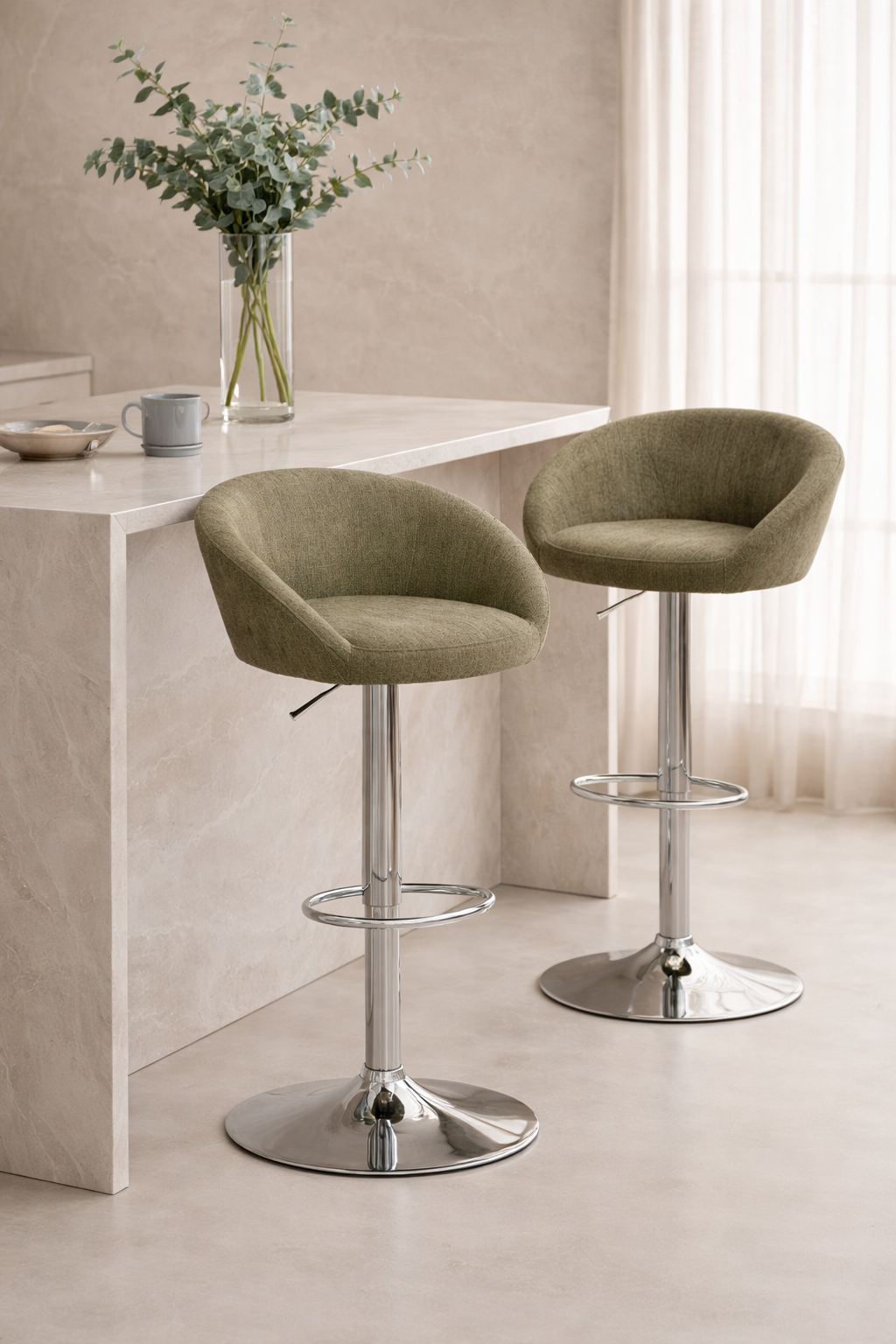 Banqueta giratoria regulable tapizada en pana velvet de alta calidad, con base metálica cromada y apoyapié integrado. Su diseño moderno y elegante la convierte en la opción ideal para barras, islas y desayunadores, aportando estilo y confort a cualquier ambiente.