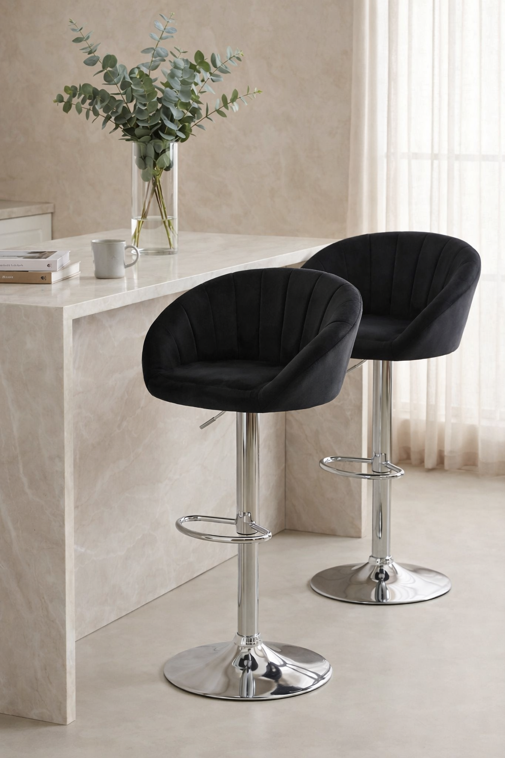Banqueta giratoria regulable tapizada en pana velvet de alta calidad, con base metálica cromada y apoyapié integrado. Su diseño moderno y elegante la convierte en la opción ideal para barras, islas y desayunadores, aportando estilo y confort a cualquier ambiente.