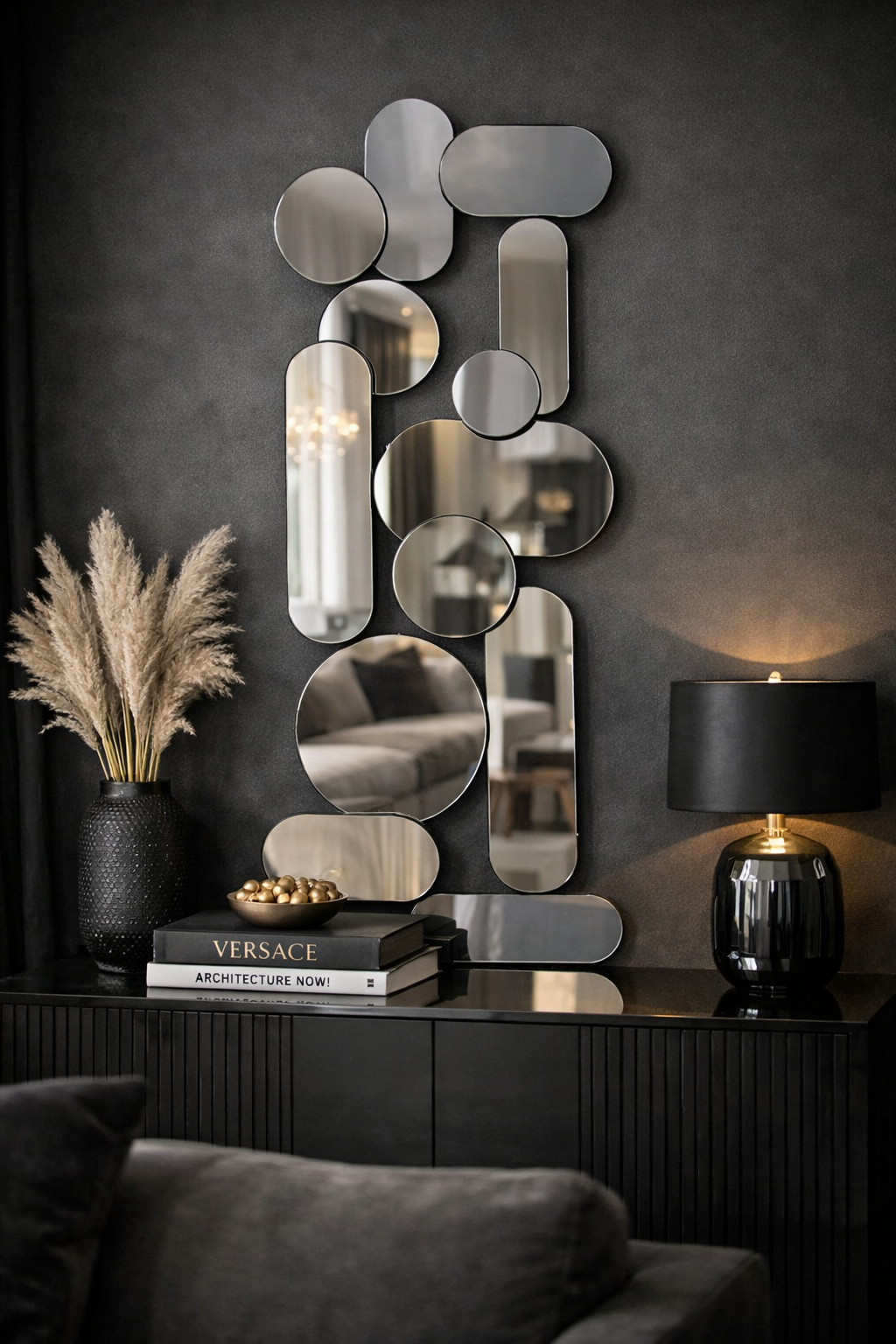 Sumá diseño, elegancia y personalidad a tus ambientes con este espejo decorativo de estilo abstracto, compuesto por múltiples piezas en formas circulares y ovaladas que crean una composición moderna y sofisticada.