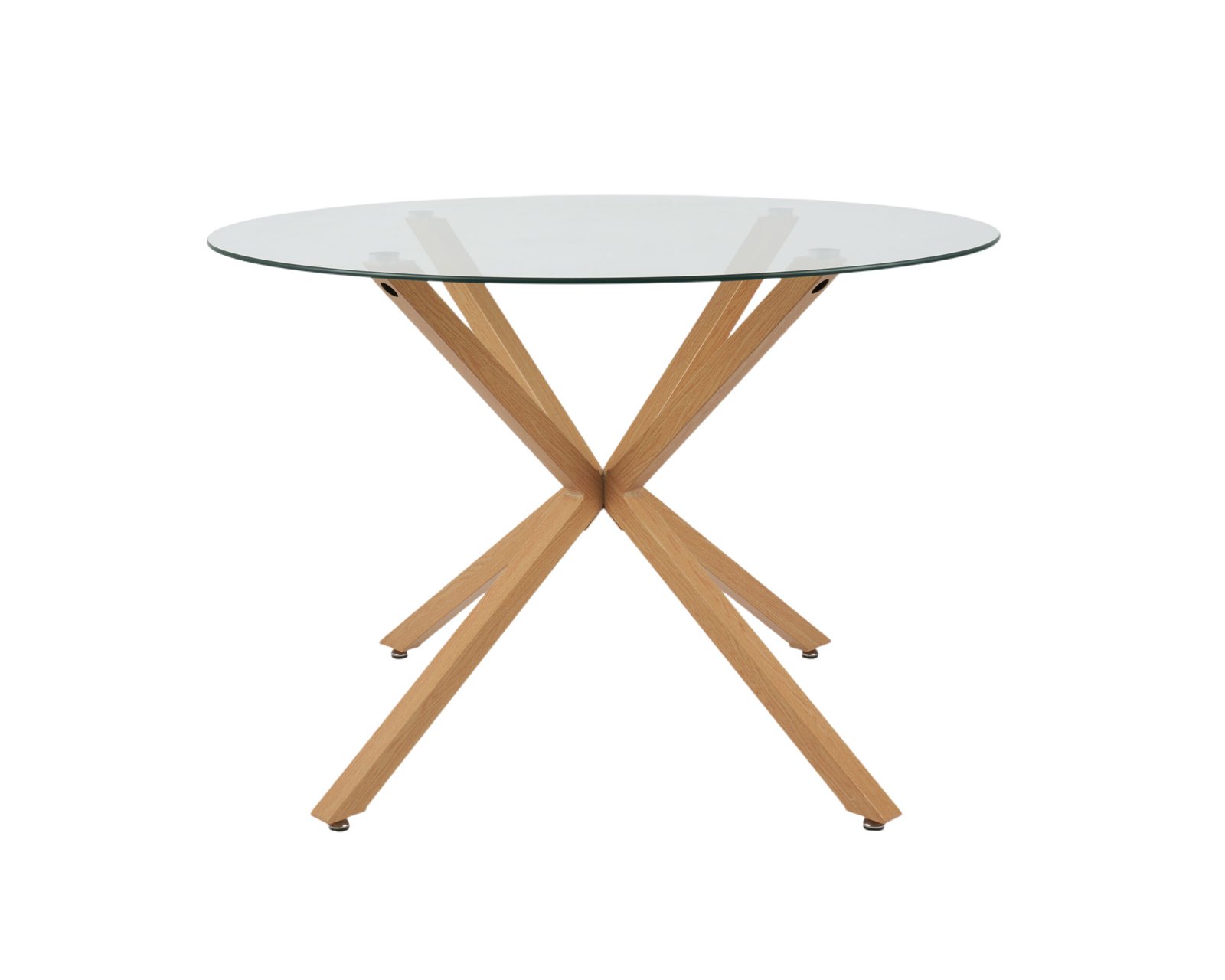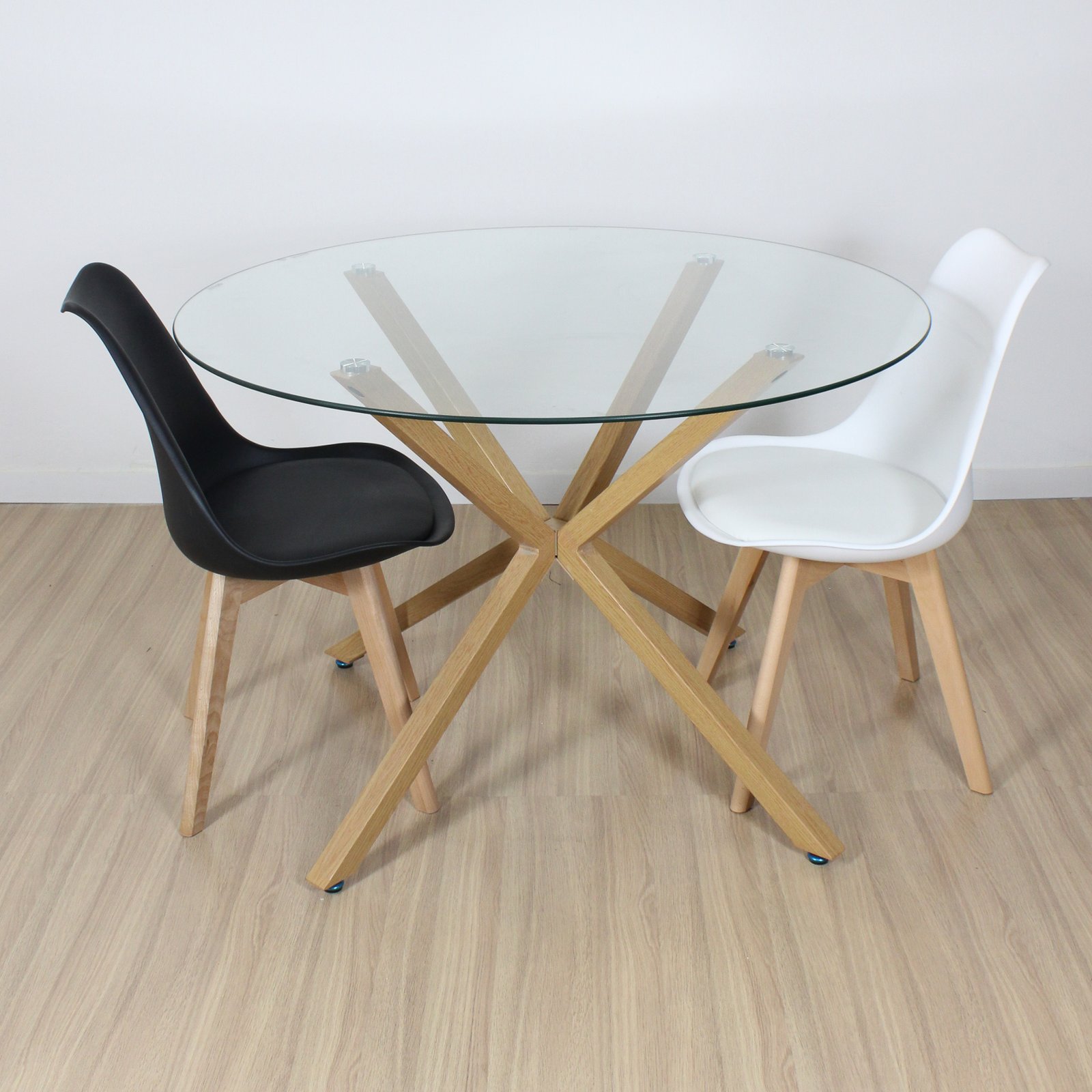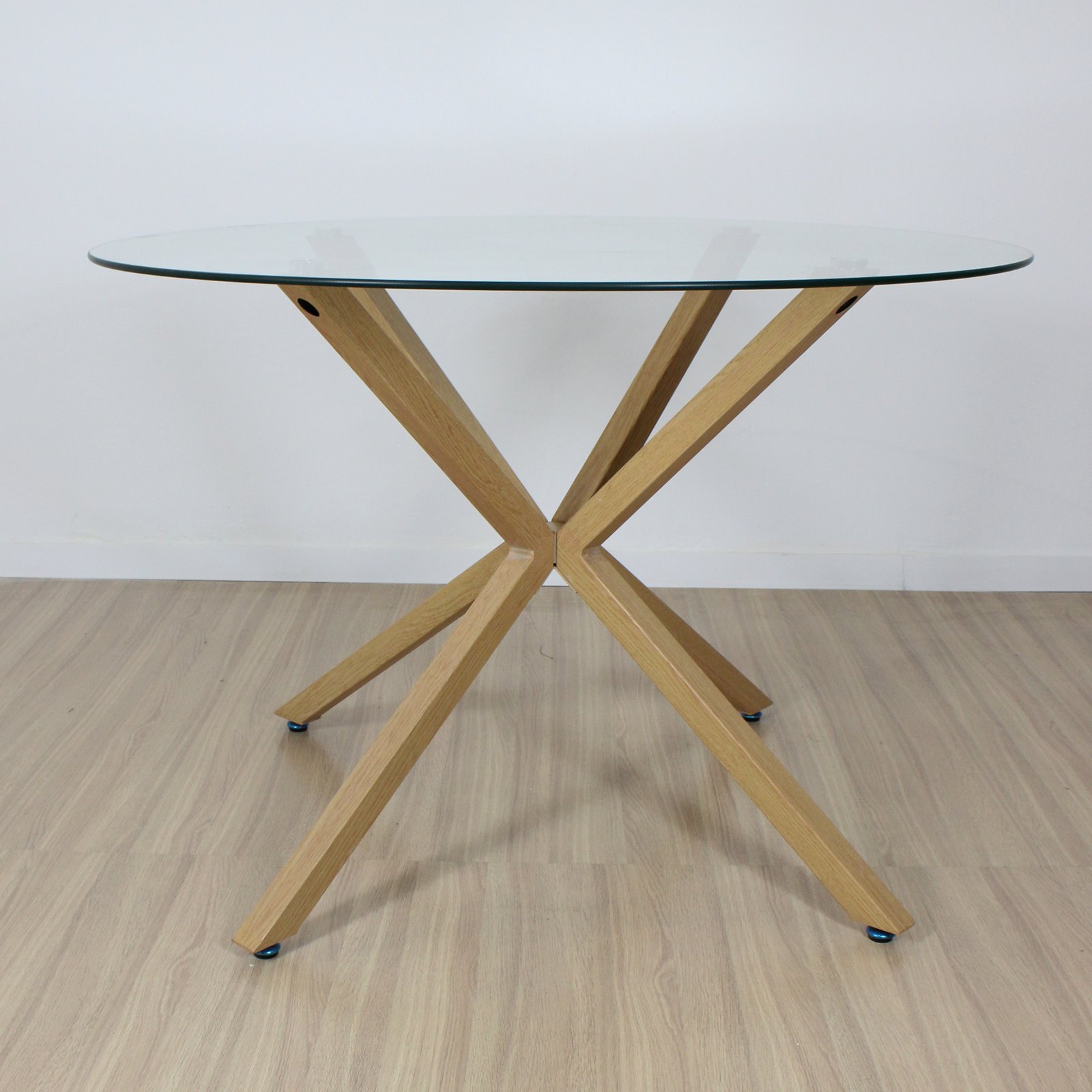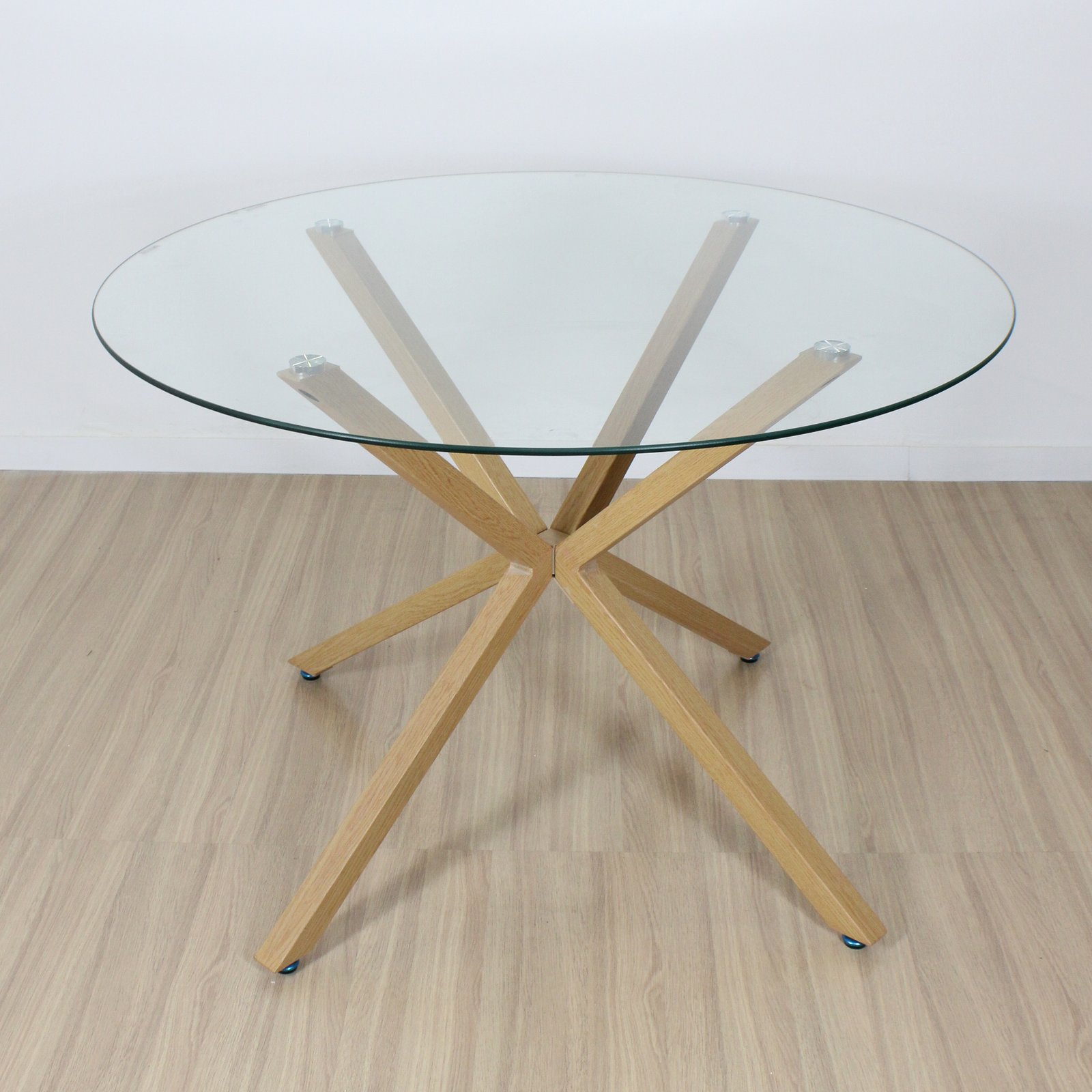 Mesa de diseño hecha en tapa vidrio de 10 mm de espesor , de patas metálicas con pintura apoxi simil madera .