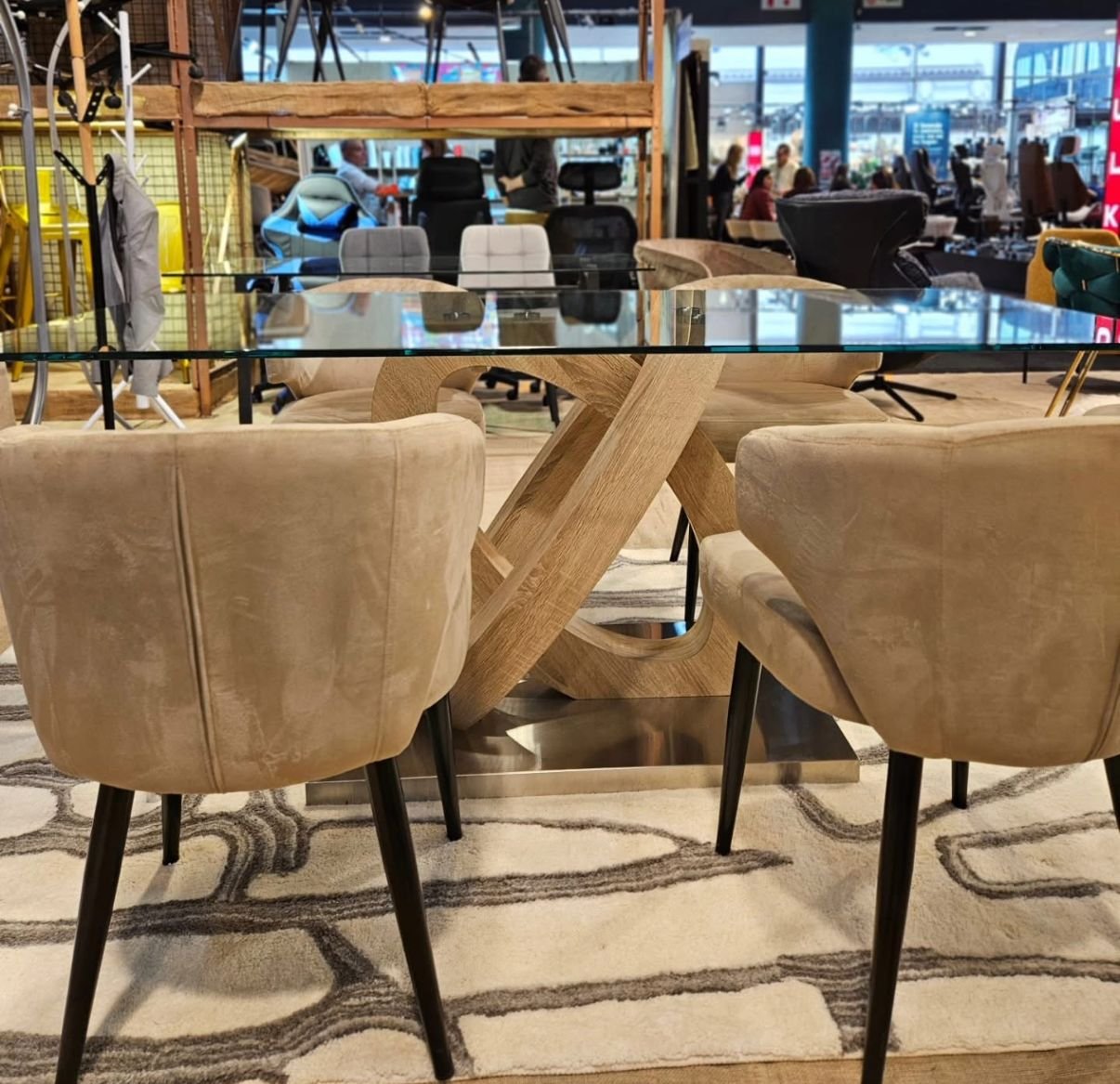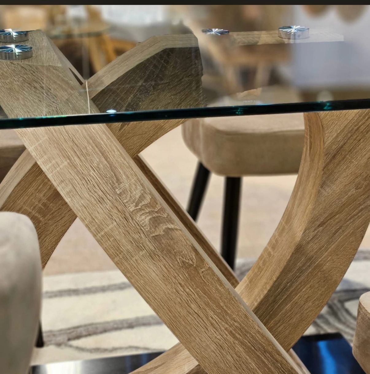 Cuenta con tapa de vidrio templado de 10 mm de espesor, resistente y segura, ideal para el uso diario sin resignar estética. Su base de diseño escultural en madera aporta carácter, estabilidad y un estilo contemporáneo que realza cualquier comedor.