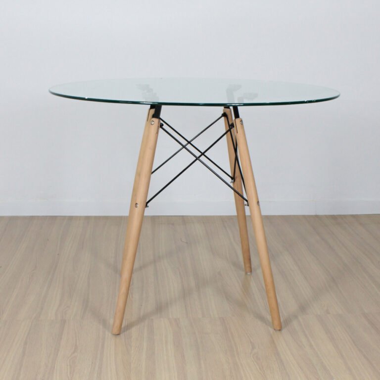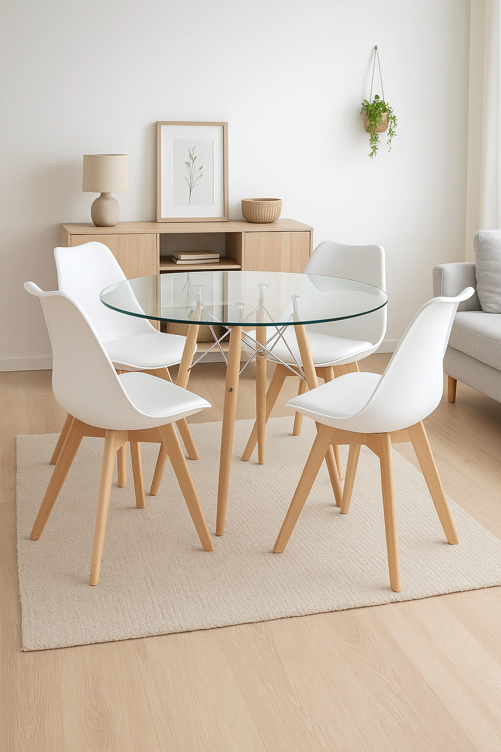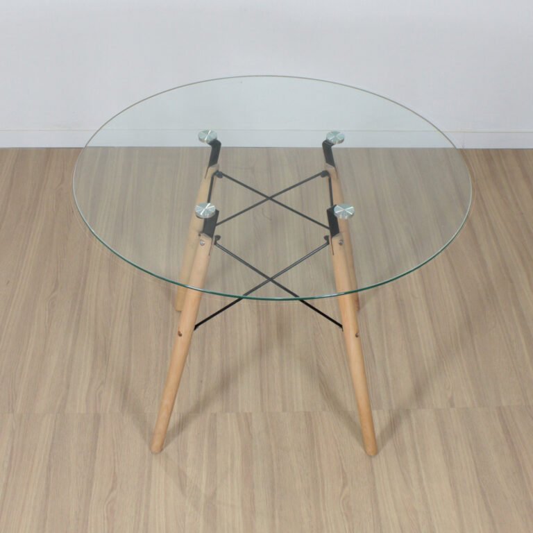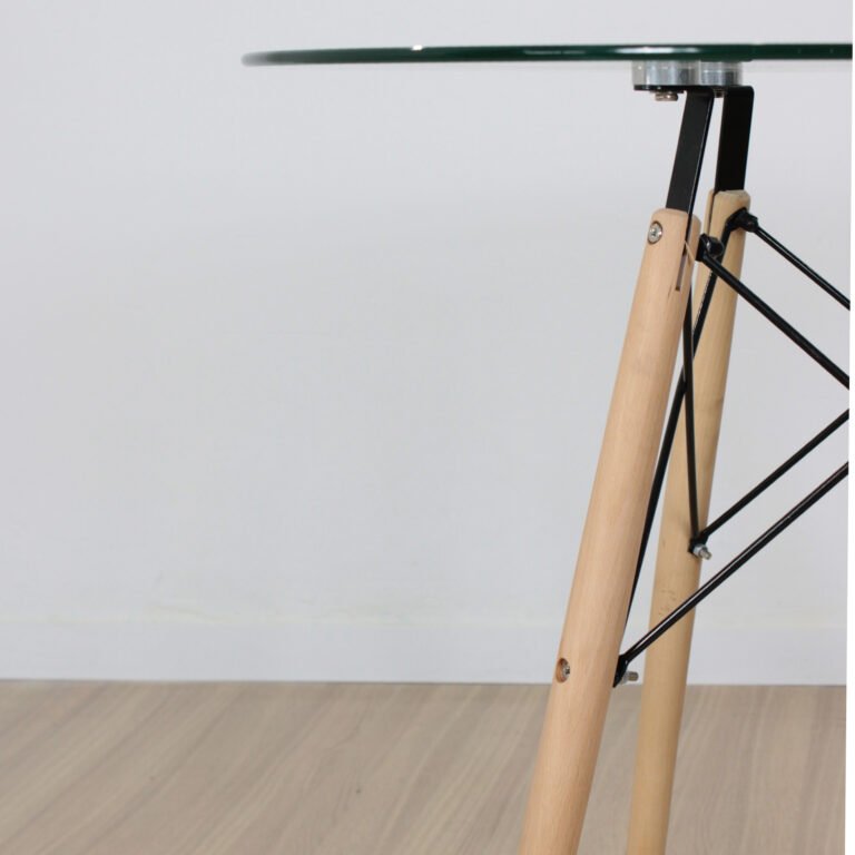 La mesa Eames redonda cuenta con tapa de vidrio templado transparente y base metálica reforzada con patas en madera natural, brindando estabilidad y estilo nórdico.