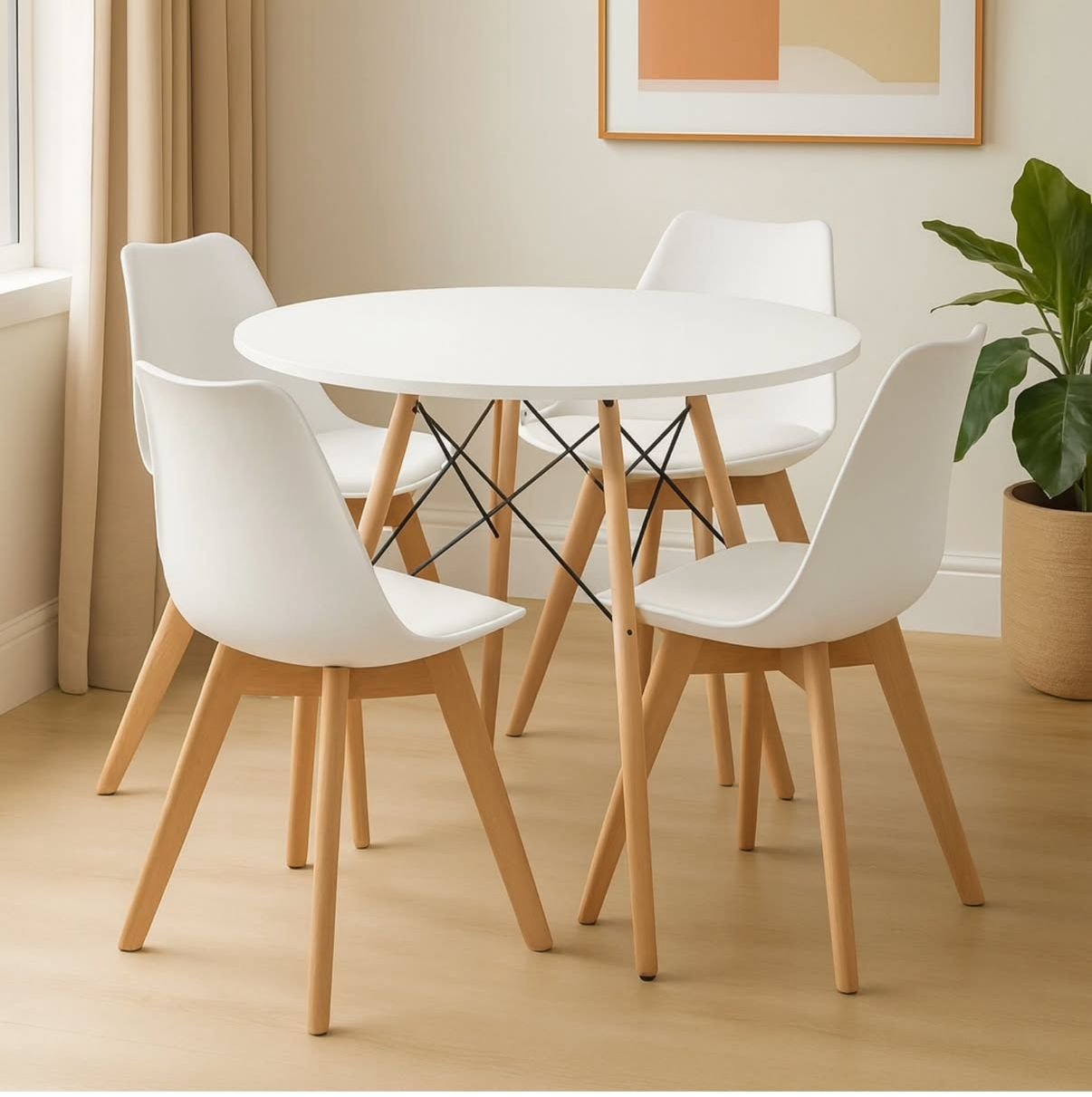 La mesa Eames redonda de 100 cm combina una tapa laqueada blanca con base metálica reforzada y patas en madera natural, logrando un diseño liviano, resistente y con estética nórdica.