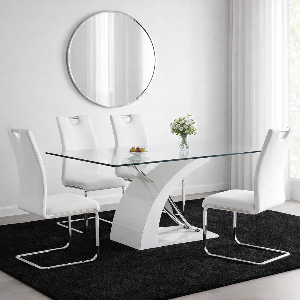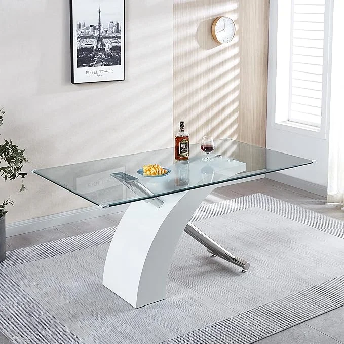 La mesa cuenta con tapa de vidrio templado de 12 mm de espesor, que aporta resistencia, seguridad y un acabado premium. Su base blanca de diseño curvo le da un estilo contemporáneo que se adapta perfectamente a ambientes modernos.