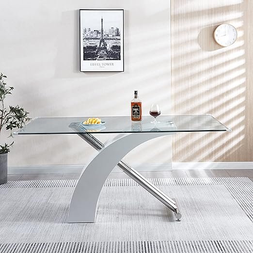 • Mesa de comedor moderna de lujo: esta mesa de comedor es una gran combinación de vidrio templado transparente y base cruzada de madera/acero inoxidable. Tiene un diseño elegante y lujoso, que podría ser adecuado para sala de estar, comedor o sala de reuniones de oficina. (Solo tabla, sillas no incluidas)