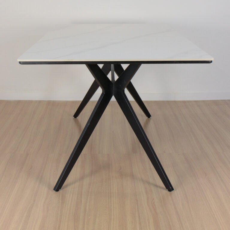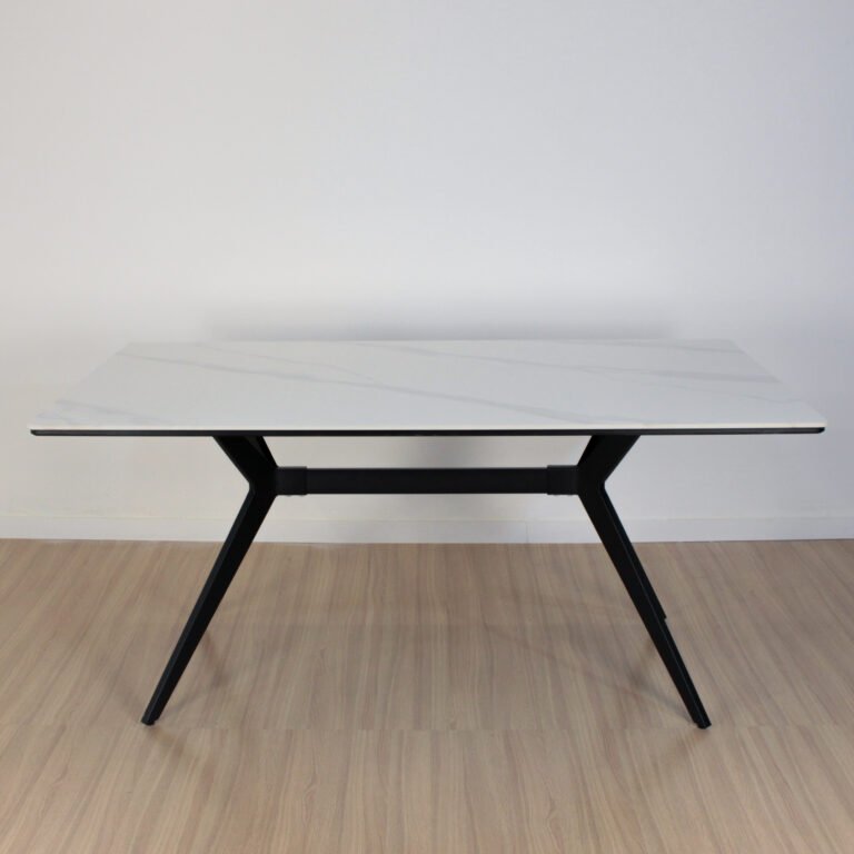 La Mesa  combina una tapa de Piedra Sinterizada (Neolith) de textura suave y aspecto marmolado, con patas metálicas pintadas en simil madera con pintura epoxi, logrando un estilo nórdico contemporáneo ideal para cualquier ambiente.