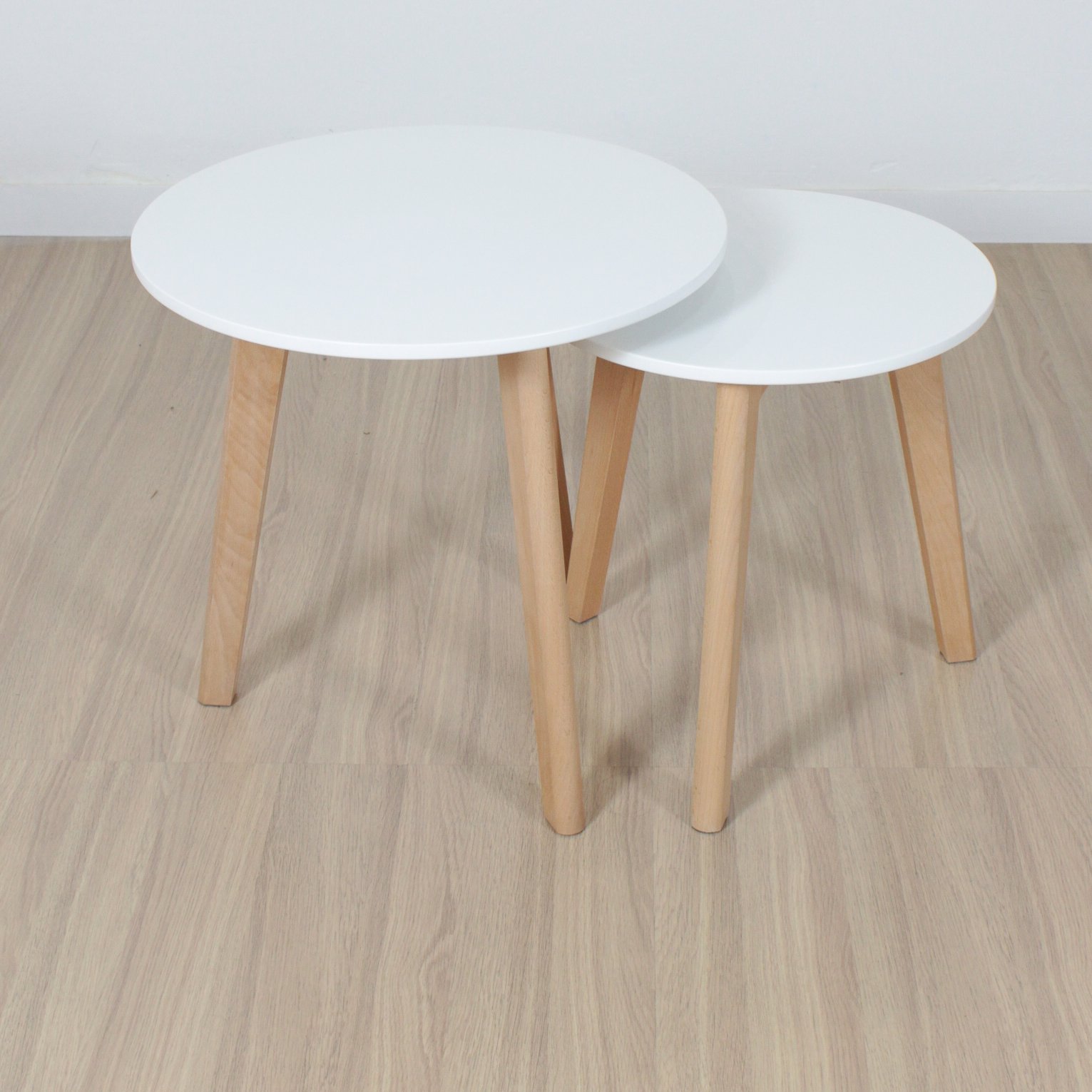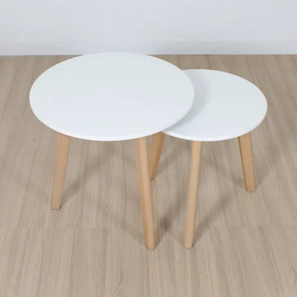 Juego de mesas ratonas tulip redondas de diseño hecha en tapa madera (MDF) laqueada.patas de madera.