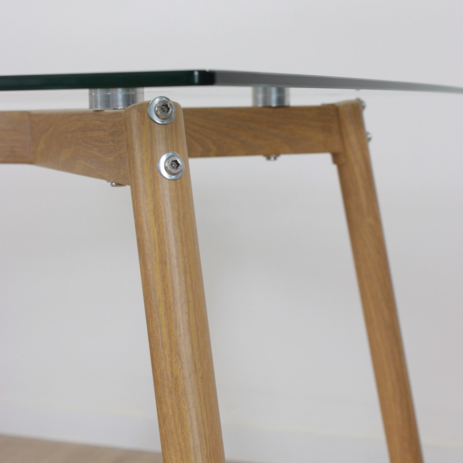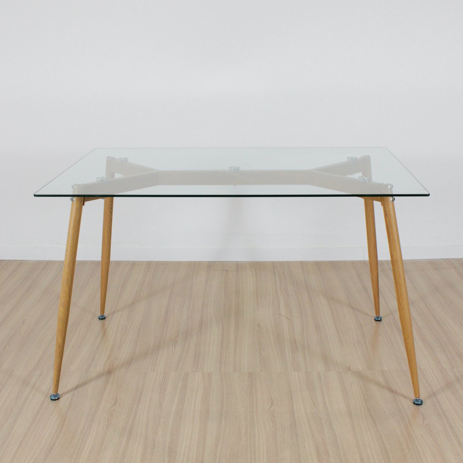 La mesa Tulip con tapa de vidrio templado transparente combina estructura metálica reforzada y patas símil madera, brindando estilo, luminosidad y durabilidad.
