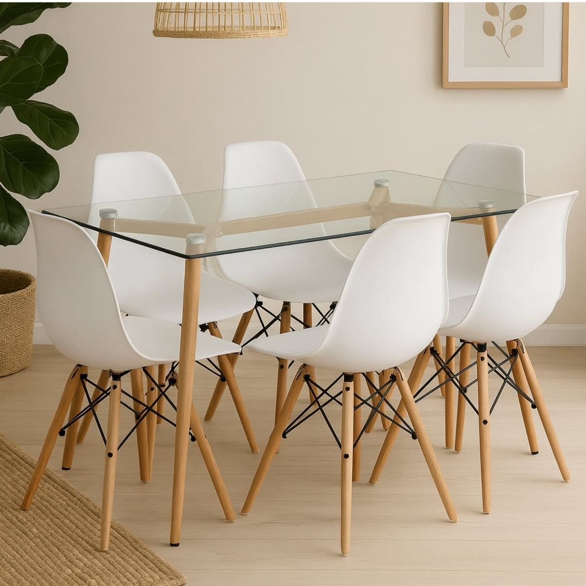 Incluye: mesa + 6 sillas Eames blancas.
