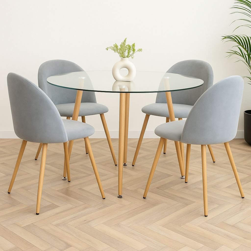 Elegante juego de comedor compuesto por una mesa redonda de 100 cm de diámetro con tapa de vidrio templado y patas sÃmil madera, acompañada por sillas tapizadas en pana soft de excelente calidad.