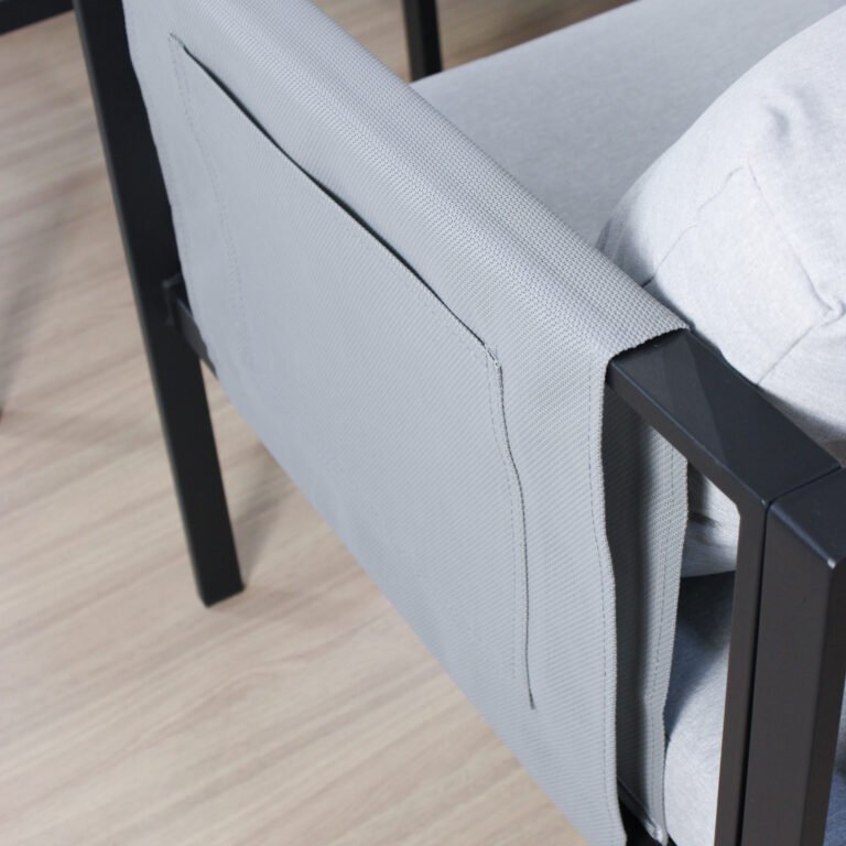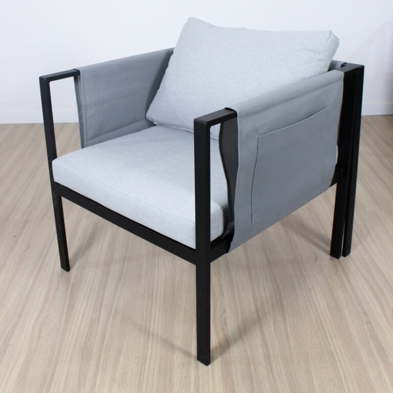 Esta hecho de hierro, con bolsllos laterales desmontables en tela textileno , la tela de los almohadones es 100% poliéster lo que lo hace impermeable y super resistente. Tiene 7 cm de espesor los almohadones del asiento.