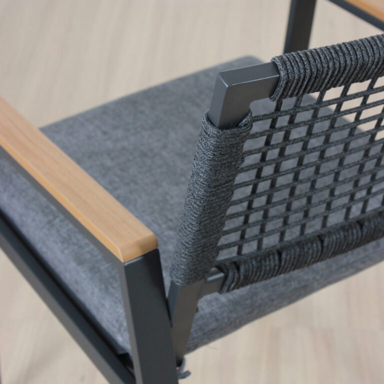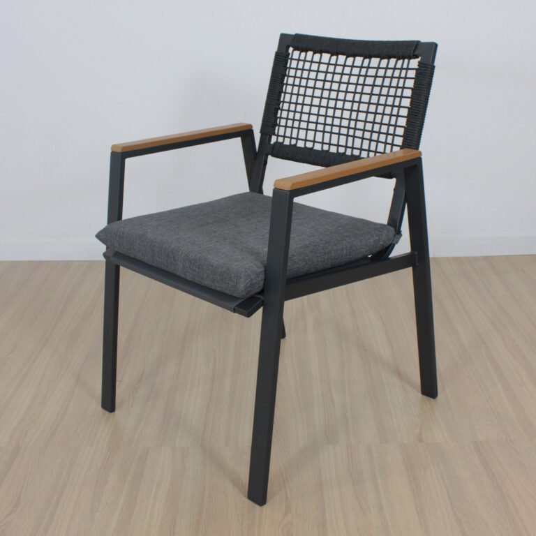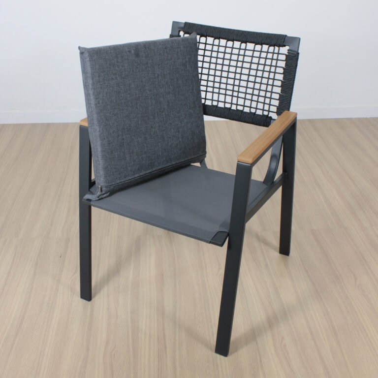 Sillas de hierro, con respaldo cuerda de 4mm,  asiento en tela textileno , con almohadones de goma espuma tapizados en tela 100% poliéster lo que lo hace impermeable y super resistente.