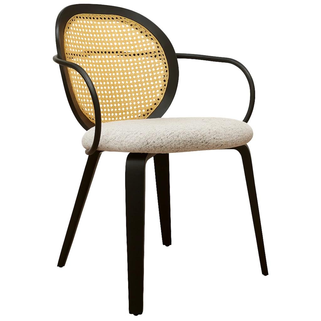 Material: Tapizada en tela texturizada estilo jacquard. Patas de madera laqueadas negras. Apoya brazos de hierro negro. Respaldo esterilla natural.