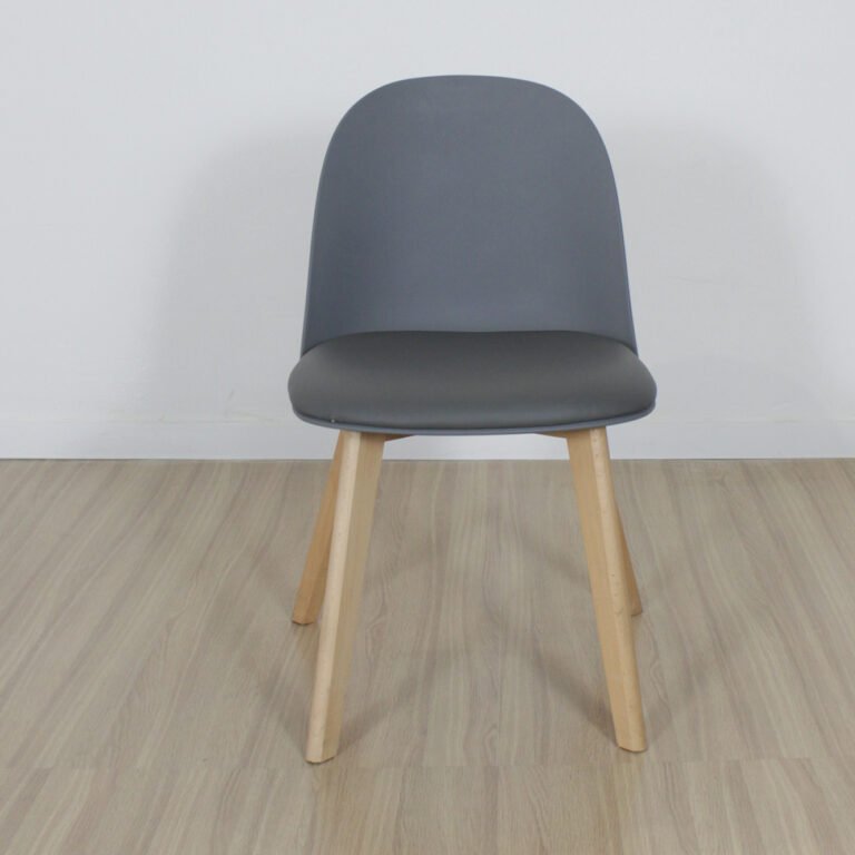 - Silla de asiento de polipropileno con almohadón acolchado de ecocuero y patas de madera haya, felpas antideslizantes .