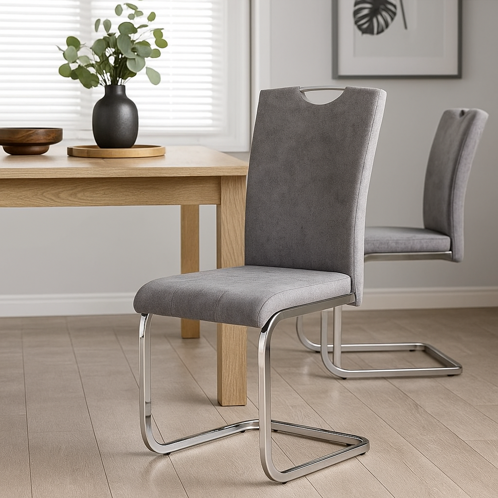 Diseño contemporáneo y elegante que combina confort y estilo. Su asiento tapizado en pana antimancha gris brinda una textura suave y sofisticada, mientras que la estructura metálica cromada aporta resistencia y brillo moderno. Perfecta para comedores, oficinas o espacios de reunión.