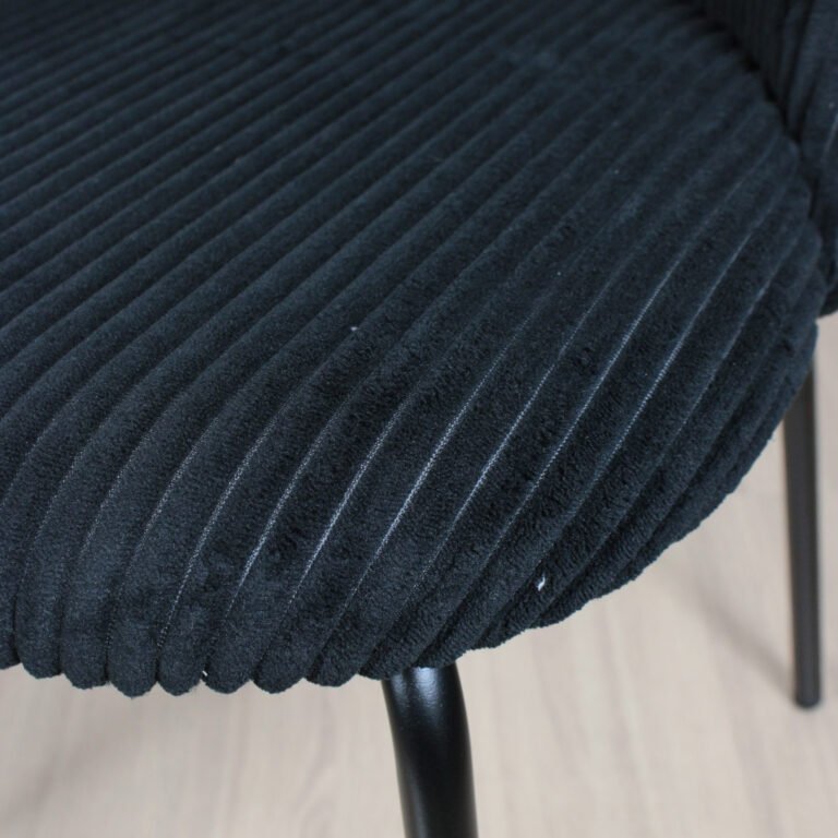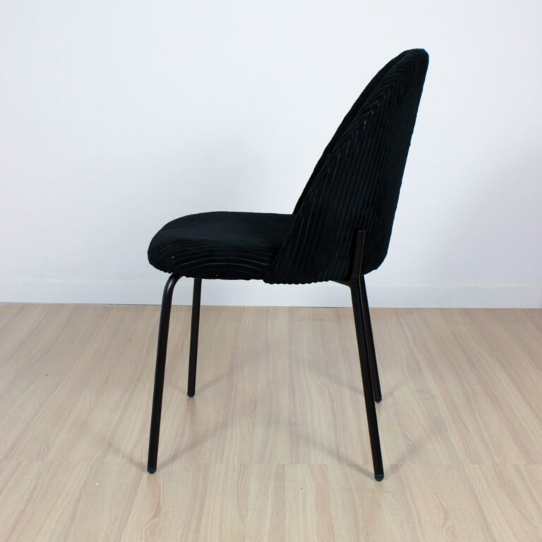 - Silla de estructura metĂĄlica patas de acero con recubrimiento de polvo negro, asiento tapizado en tela de corderoy.