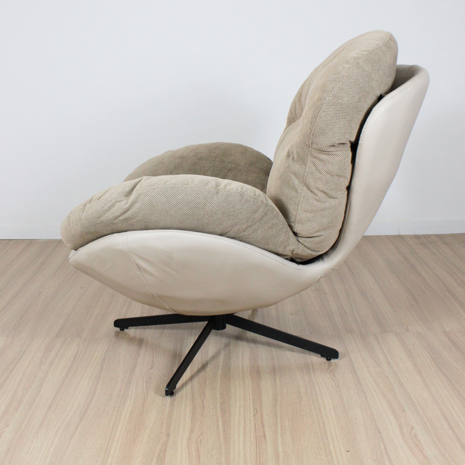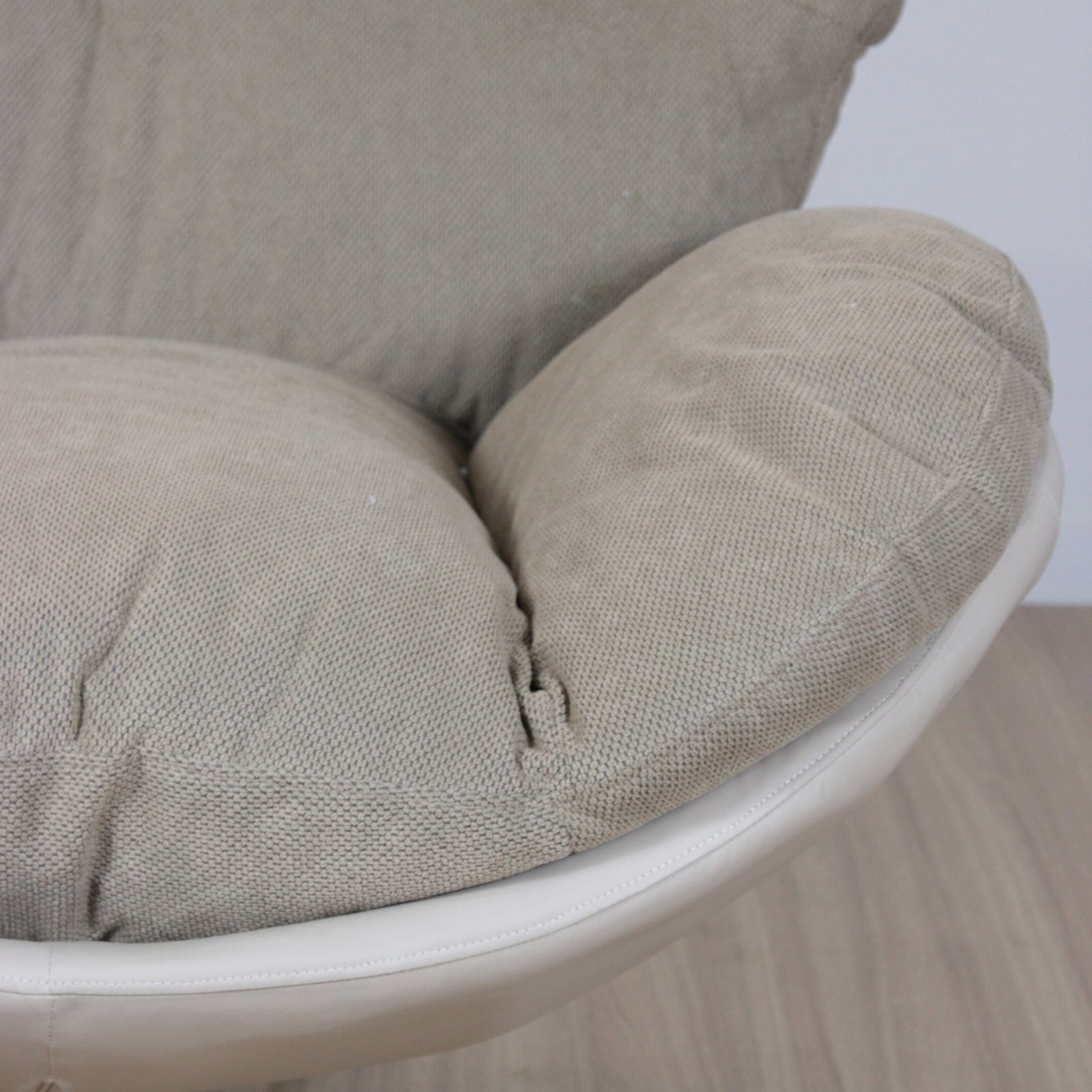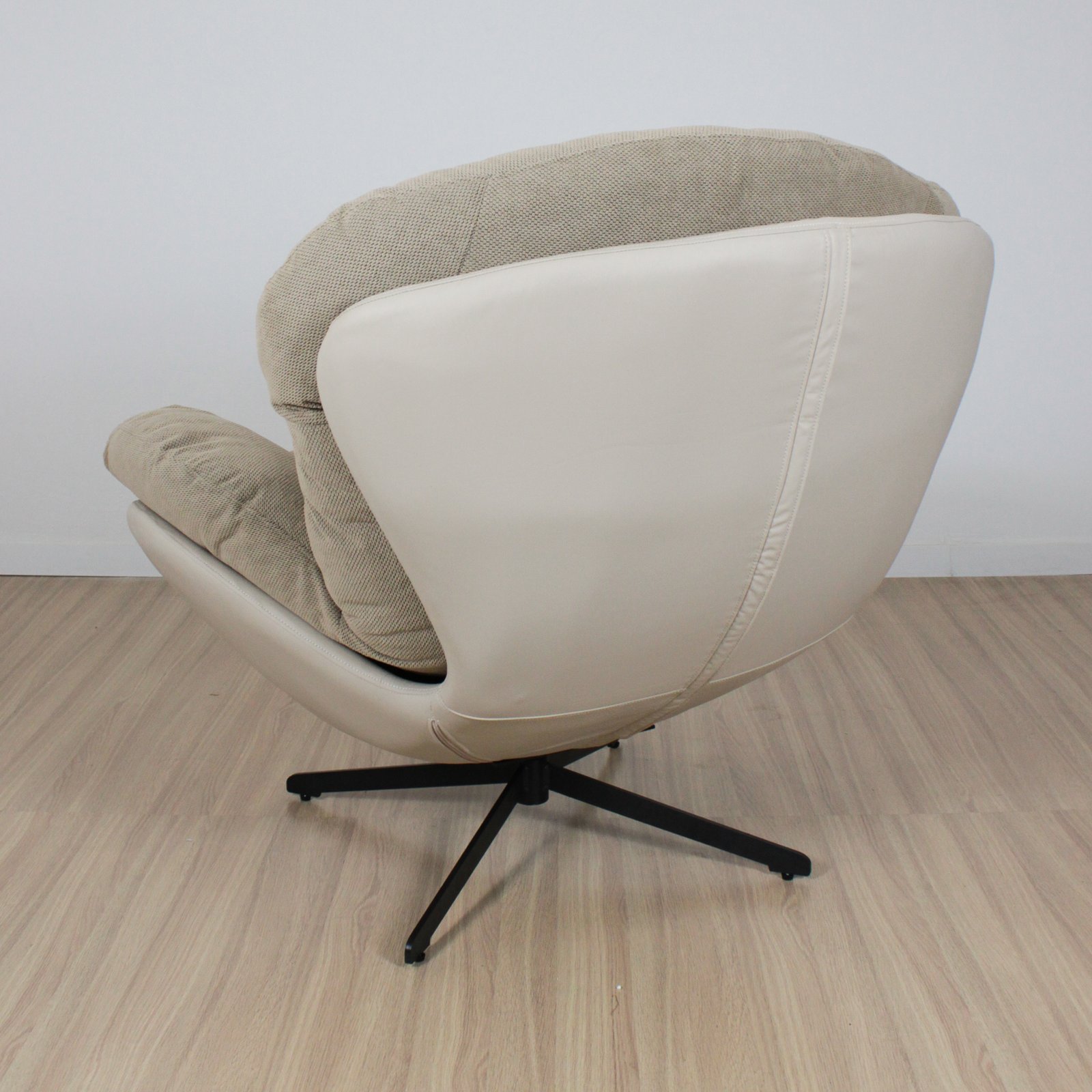 Sillón de diseño Eglis , tapizado en tela de chenille, super relleno y acolchonado. Parte inferior, tapizada en ecocuero con base de acero negra de cuatro soportes. Giro de 360 grados, diametro de la base 77 cm.