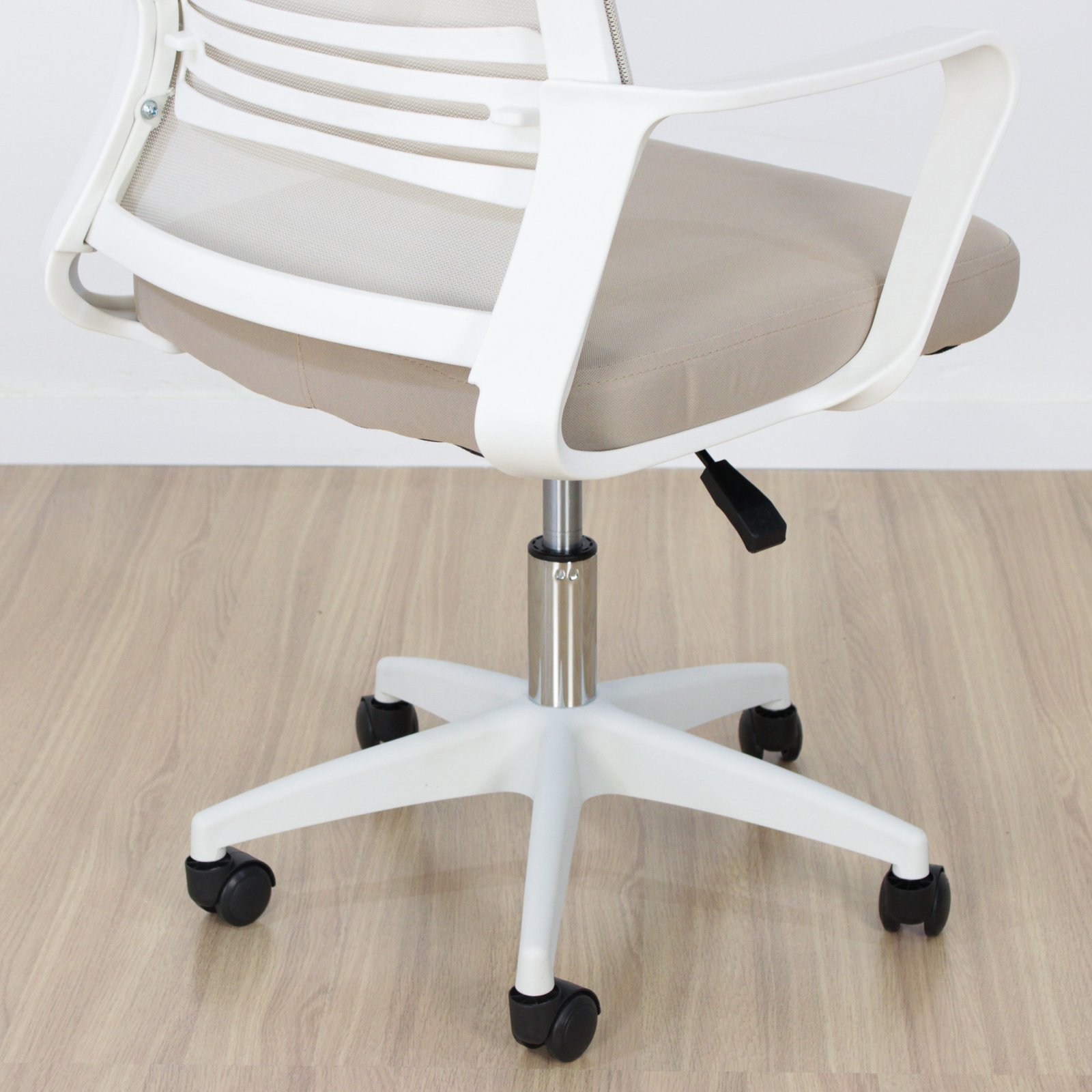 Silla con apoyabrazos, giratoria de base de nylon (todo lo blanco) y altura regulable, el asiento es de polimadera+espuma+cubierta de malla .